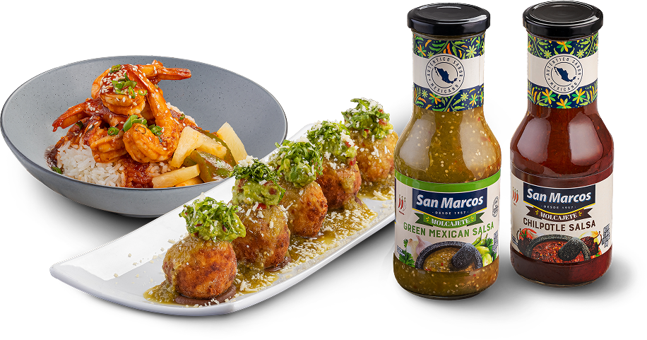 Mexican tradition in every bite: masa (corn dough) filled with beans, topped with queso fresco, onion, and San Marcos salsa.